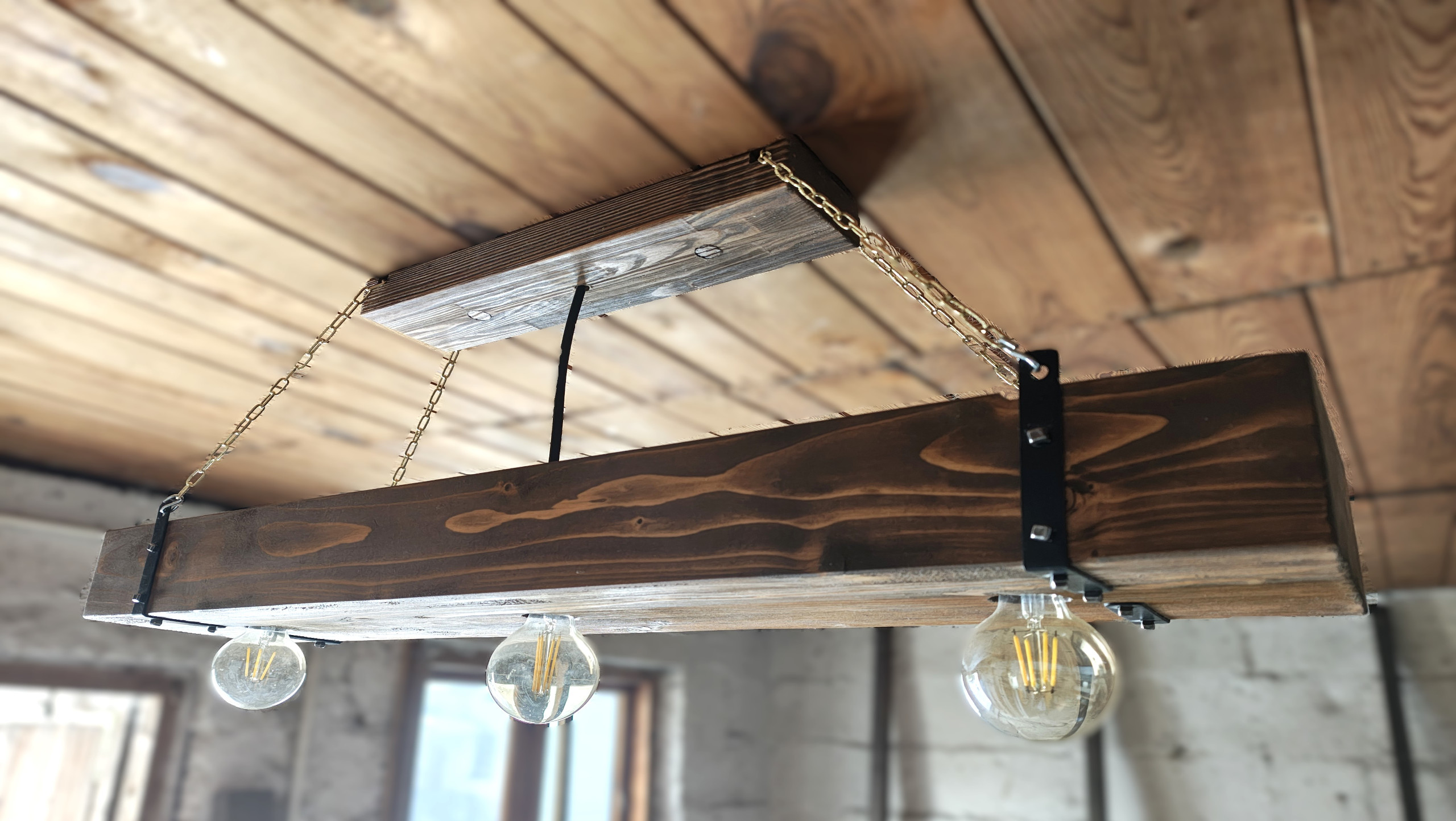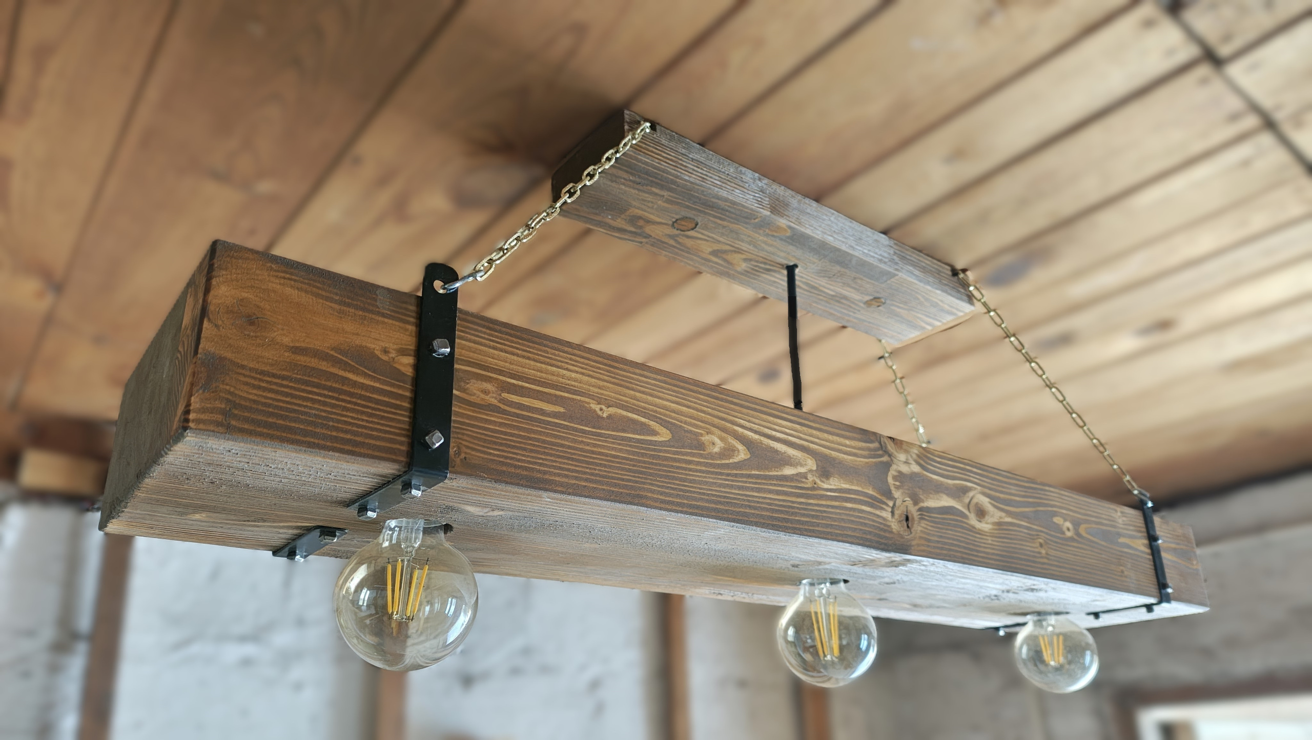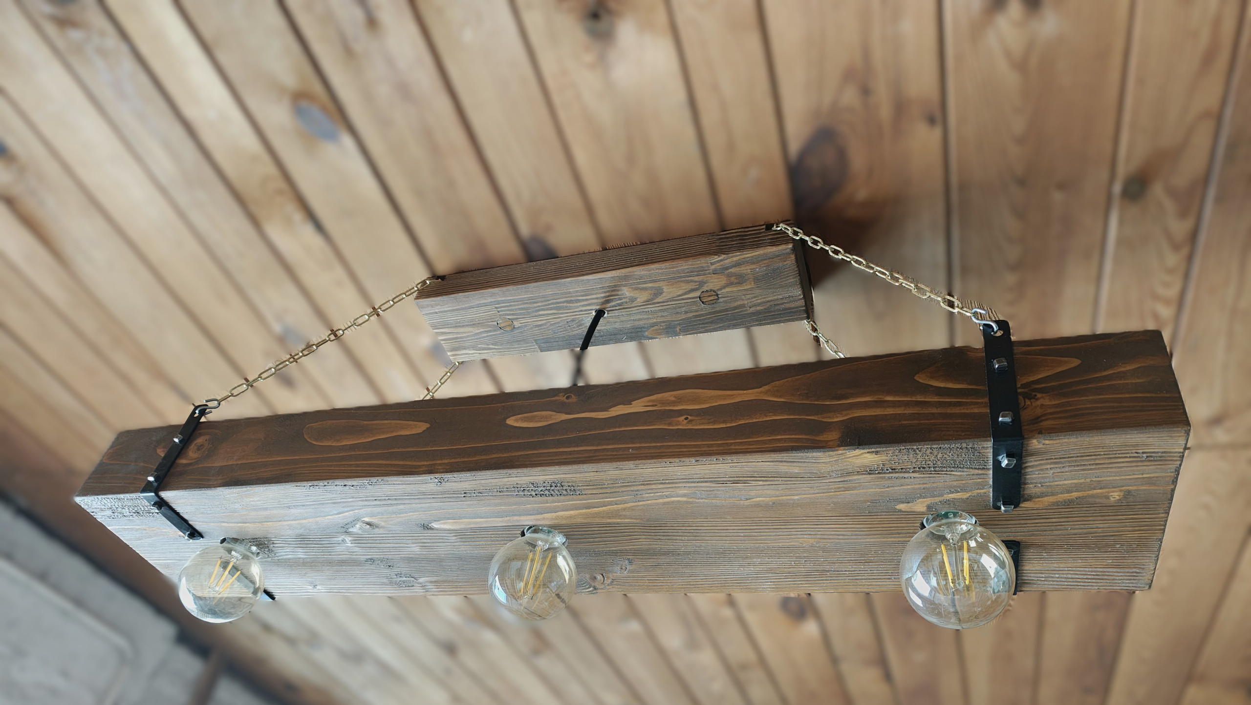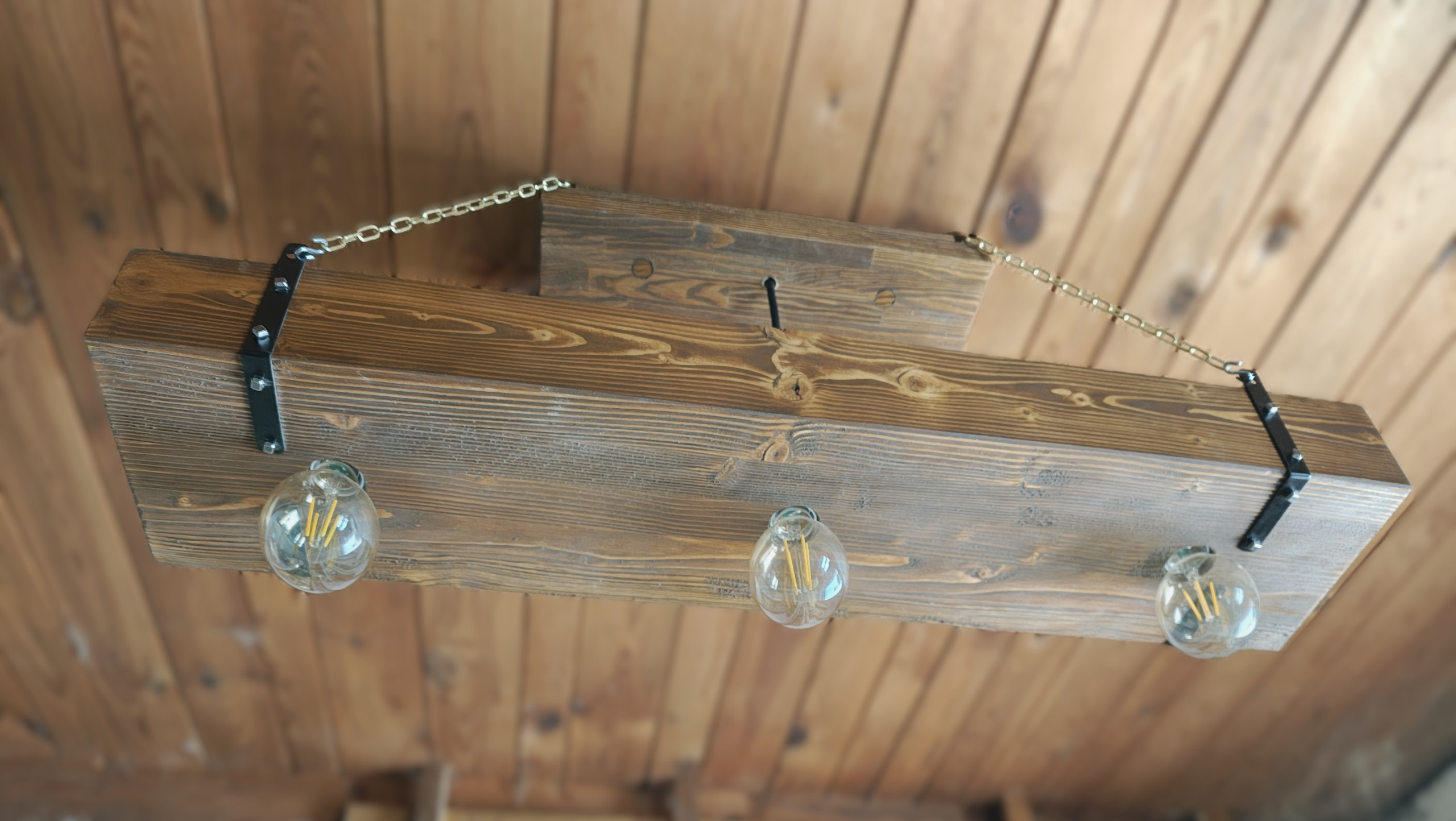Stylowy, drewniany, zawieszany na łańcuchach żyrandol w rustykalnym stylu. Wykonany z postarzanego, szczotkowanego drewna klejonego, nadającego mu niepowtarzalny charakter i styl. Idealny do wnętrz w stylu vintage, retro, boho, loft. Perfekcyjnie wkomponuje się również jako oświetlenie tarasu lub pergoli. Idealny do restauracji, zajazdu bądź innego punktu gastronomicznego. Na zdjęciach produkt przedstawiony w dwóch wymiarach w dwóch wymiarach: 100x200x1000 mm (10x20x100 cm) w cenie 350zł oraz 100x200x700 mm (10x20x70 cm) w cenie 300zł. Produkt przyjazny w montażu, bardzo solidny. Uwaga! Brak żarówek w zestawie. Przedstawiony na zdjęciach kolor to Złoty Dąb. Istnieje możliwość wykonania lampy w dowolnym wymiarze oraz jednym z kolorów przedstawionych na palecie.