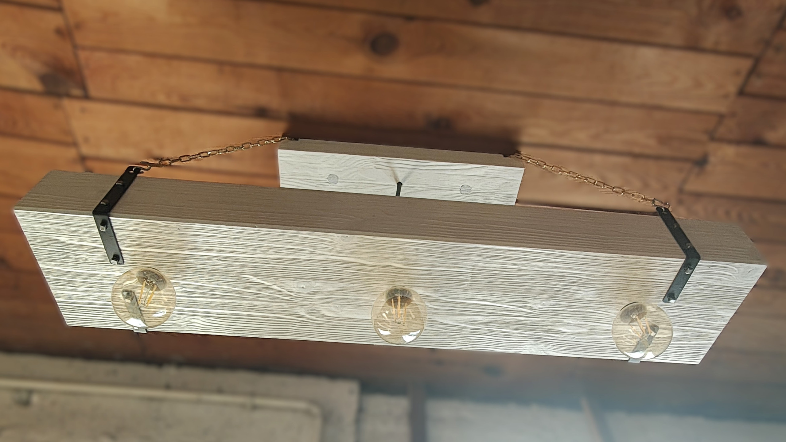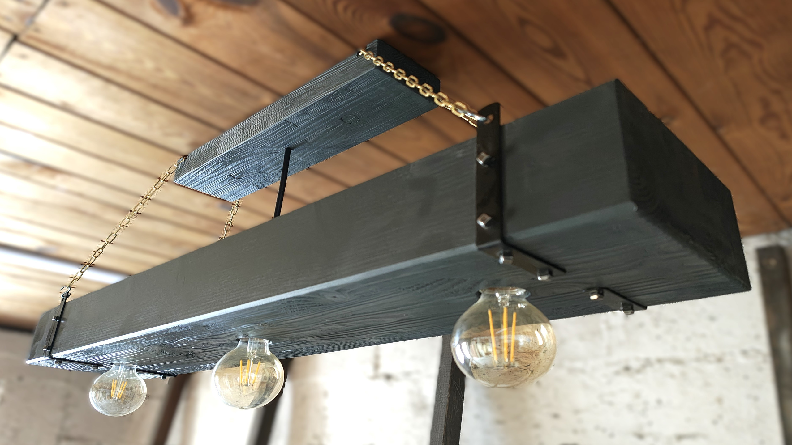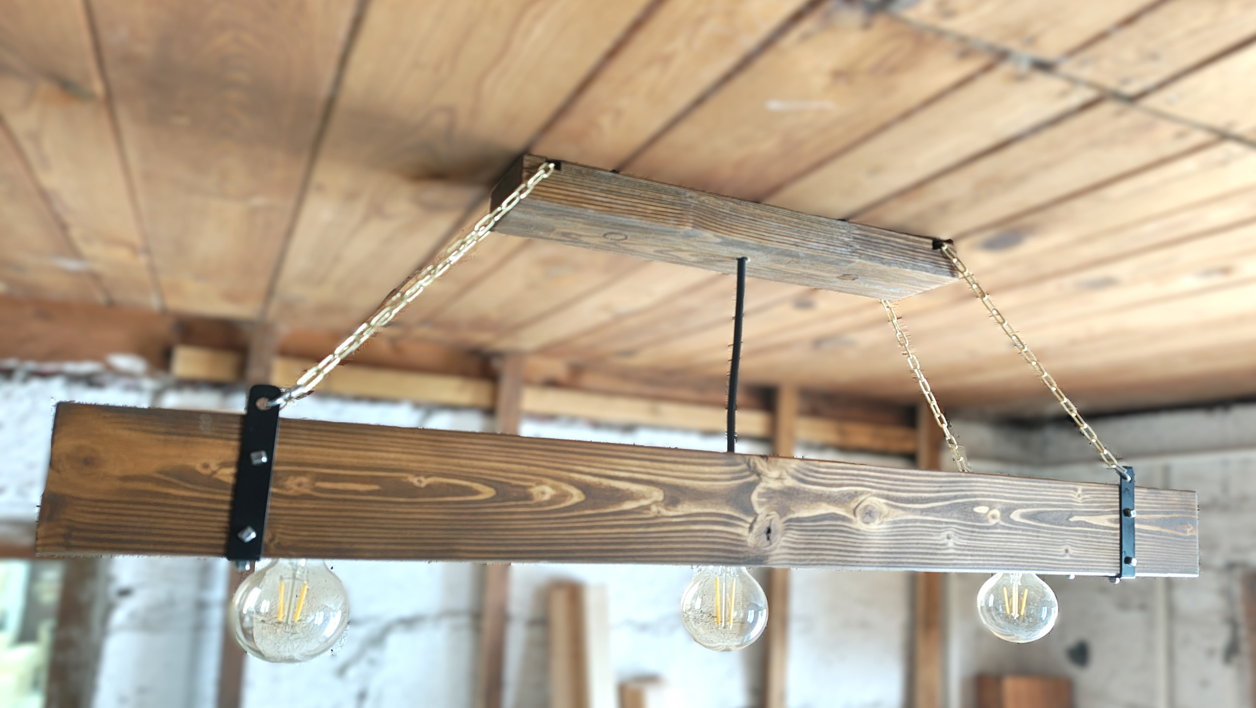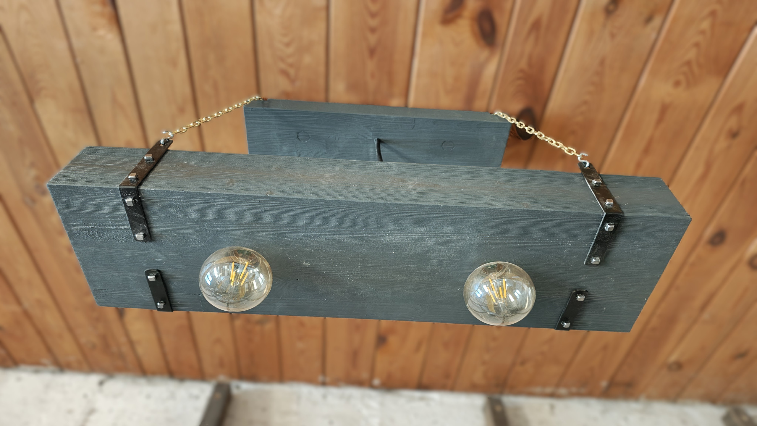 Stylowy, drewniany, zawieszany na łańcuchach żyrandol w rustykalnym stylu. Wykonany z postarzanego, szczotkowanego drewna klejonego, nadającego mu niepowtarzalny charakter i styl. Idealny do wnętrz w stylu vintage, retro, boho, loft. Perfekcyjnie wkomponuje się również jako oświetlenie tarasu lub pergoli. Idealny do restauracji, zajazdu bądź innego punktu gastronomicznego. Na zdjęciach produkt przedstawiony w dwóch wymiarach w dwóch wymiarach: 100x200x1000 mm (10x20x100 cm) w cenie 350zł oraz 100x200x700 mm (10x20x70 cm) w cenie 300zł. Produkt przyjazny w montażu, bardzo solidny. Uwaga! Brak żarówek w zestawie. Przedstawiony na zdjęciach kolor to Złoty Dąb. Istnieje możliwość wykonania lampy w dowolnym wymiarze oraz jednym z kolorów przedstawionych na palecie.